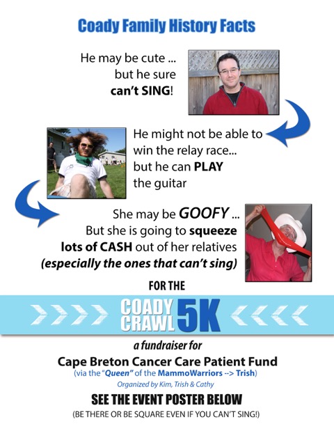 For those that may need to recharge themselves after the previous night we are planning a little fundraiser for the Cape Breton Regional Cancer Care Patient Fund or the CBRCCPF for those that like acronyms. We will collect donations and participants on Sunday evening. Keep in mind Monday at 11 may be a bit early for some!